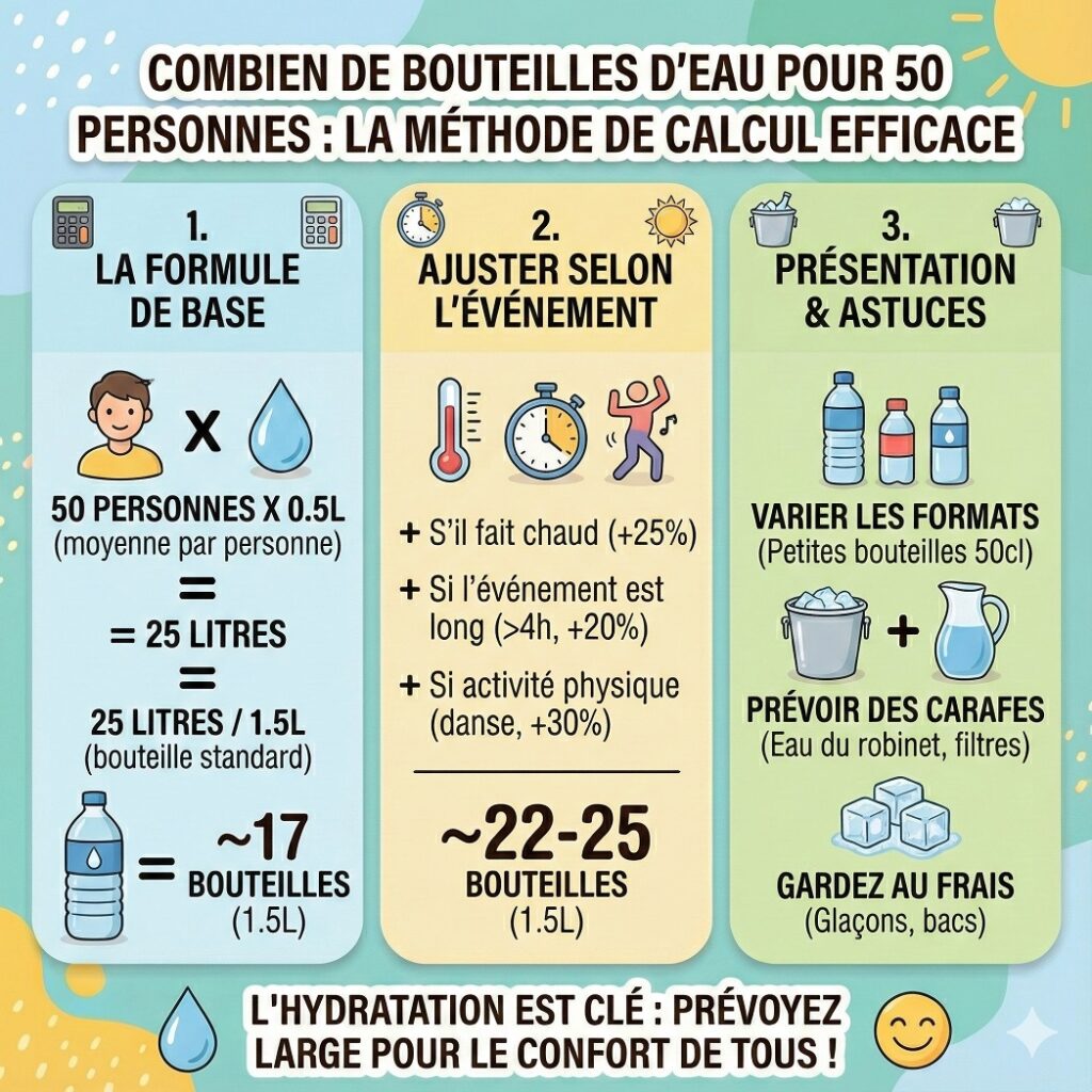Le calcul précis de la quantité de bouteilles d’eau pour 50 personnes